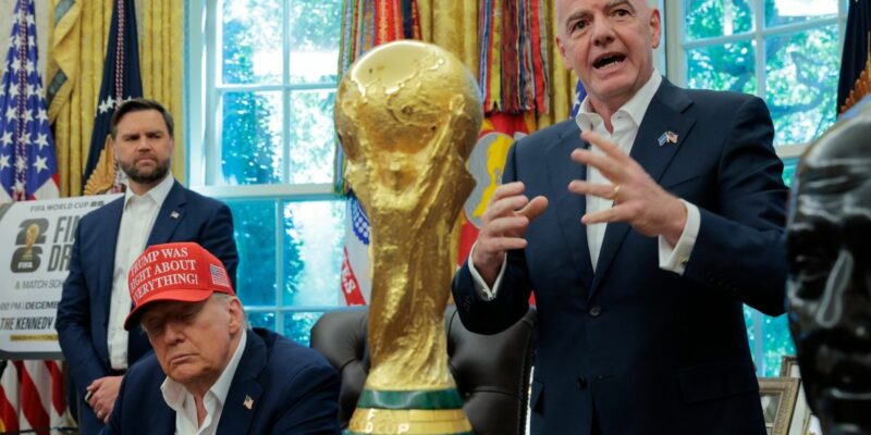 FIFA President Gianni Infantino shows U.S. President Donald Trump the World Cup Trophy in the Oval Office.